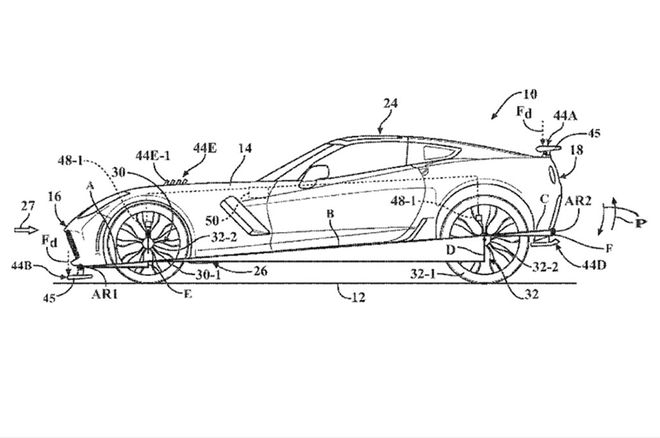 Patent je zaveden u maju 2016., ali je objavljen danas. Opisan je kao „sistem za kontrolu aerodinamike vozila“. Deo te „kontrole“ uključuje varirajuću visinu karoserije za optimalne aerodinamičke performanse. Priloženi skeč prikazuje Corvette sa boka i ističe različite predložene izmene. Vidi se novo krilo, difuzor, spliter, usisnik za vazduh i regulišući otvori na haubi motora. Ono što predstavlja važniji aspekt ovog sistema je varijabilni klirens.