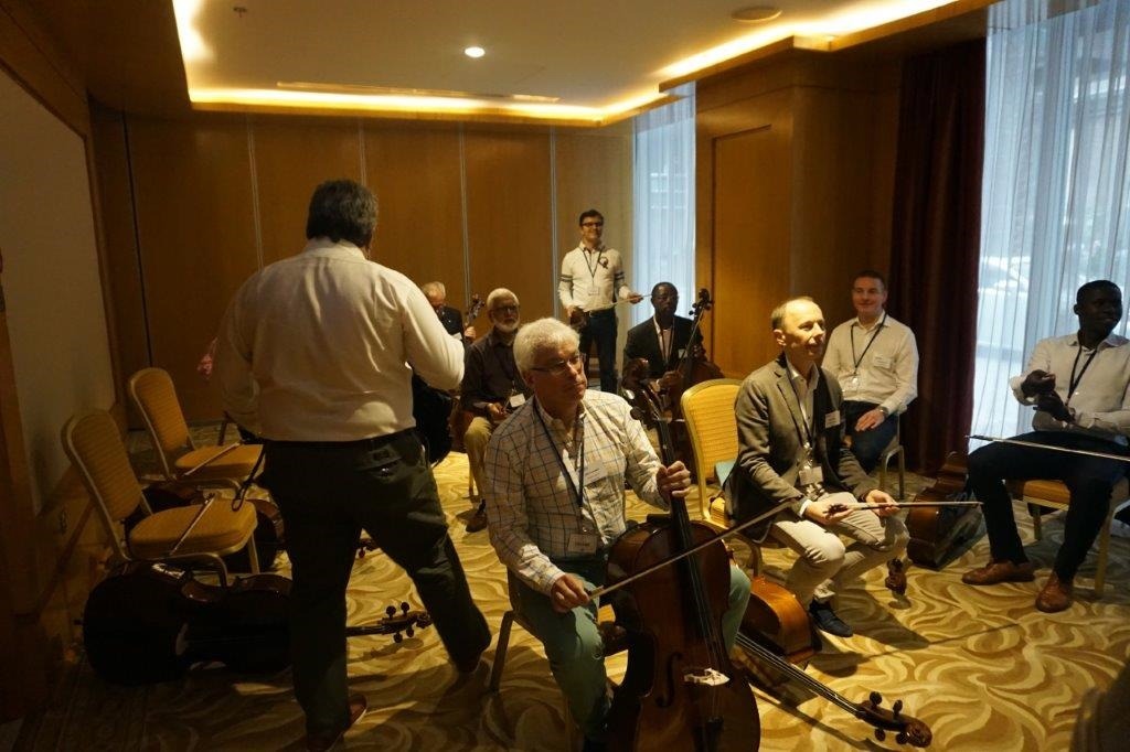 Događaj koji me je kupio i definitivno obeležio dan se odigrao u dva sata. Carmina Burana u izvođenju orkestra sačinjenog od, u većini, proćelavih tipova najzainteresovanijih za poreske i pravne sisteme, strukturiranje transakcija, računovodstvene i proceniteljske standarde. Moje kolege iz Evrope, Afrike i Bliskog istoka (EMEA region). Grupe od po dvadesetak, u realnoj svakodnevici, dosadnih likova, koji su se ovom prilikom transformisali u ushićenu dečicu, su svirale razne instrumente. Ja sam bio u violončelo grupi. Imali smo I timove violina, bubnjeva, trubača (ni nalik onima u Guči), vokalni ansambl… Simpatični Južnokorejac (Hyundai/Kia man) se iskidao da nas nauči ukupno stotinak repetirajućih taktova iz legendarne kompozicije.
