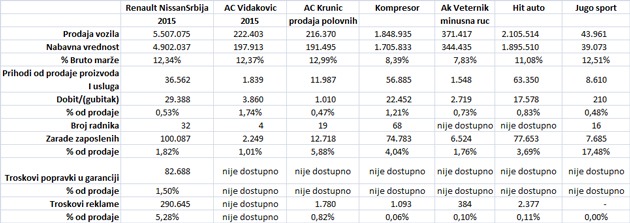 Plasman ovih vozila se odigrava, u principu, na vrlo sličan način onom koji je Toyota postavila. Znači, Renault S.A.S, Francuska je osnovao Renault Nissan Srbija d.o.o., Beograd (Društvo) još 2005. godine, ali se nabavka automobila vrši takođe, uglavnom iz Republike Slovenije, baš kao i u Toyota Srbija. Naime, Renault Nissan Adriatic obuhvata teritoriju bivše SFRJ i Albanije. Zbog značaja Renault fabrike u Novom Mestu, direkcija za ovu teritoriju se nalazi u Ljubljani i sva vozila i delovi se isporučuju od strane filijale Renault Nissan Slovenija, čiji je vlasnik isti kao Društvu. Međutim, Društvo nema svoju maloprodaju (svoj Toyota centar) već se plasman krajnjim kupcima obavlja preko 17 maloprodajnih distributera od kojih po obimu realizacije ubedljivo dominiraju Hit auto (Beograd) i Kompresor prodaja automobila (Beograd) i sa kojima Društvo ima zaključenu koncesiju o prodaji vozila iz njihovog asortimana. Zbog praktičnih razloga, prikazali smo samo deo njih, jer verujem da je uzorak reprezentativan. Ono što, bez pomoći rukovodstva Društva, ne možemo da razlučimo je vrlo značajno u smislu naše želje da analiziramo brendove automobila, jer su javno dostupne informacije prezentovane za celokupnu ponudu i nisu segregovane po markama. Sve informacije koje su nas zanimale su ostale poslovna tajna, što je u neku ruku i razumljivo. Teško da bi sa javnošću, i sam, podelio strukturu prihoda i profita naše firme po uslužnim linijama: revizija, računovodstvo, porezi, procene vrednosti i ostali konsalting.