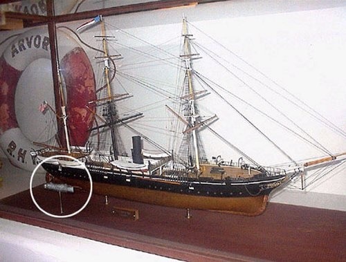 Maketa potopljenog Housatonica. Zaokruženi deo pokazuje gde je Hunley postavio eksploziv.
