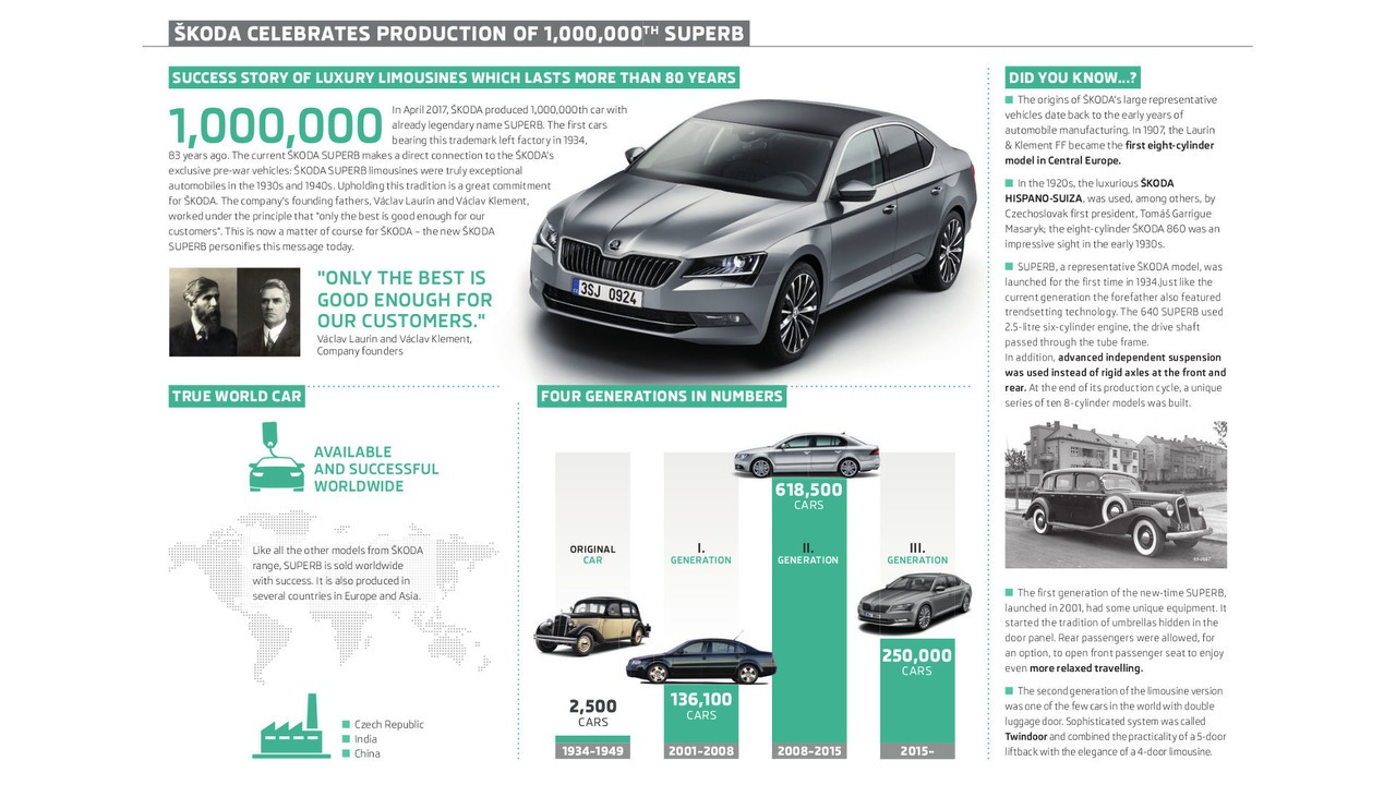 Milioniti Superb je sklopljen u fabrici u Kvasiniju u Češkoj Republici, ali se Škodina perjanica proizvodi i u nekoliko drugih zemalja. Jubilarni model je prestižni Laurin & Klement „liftback“ model.