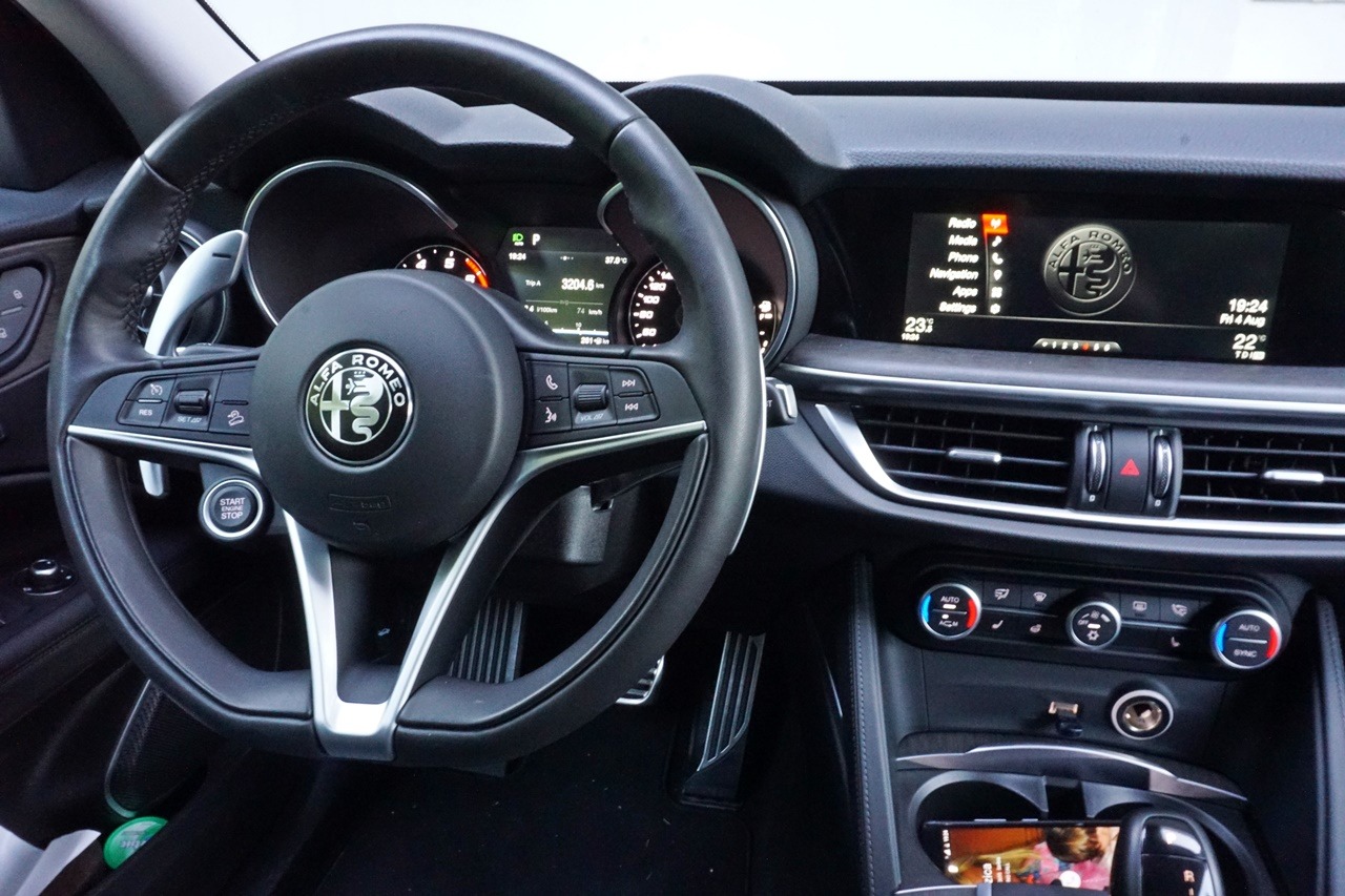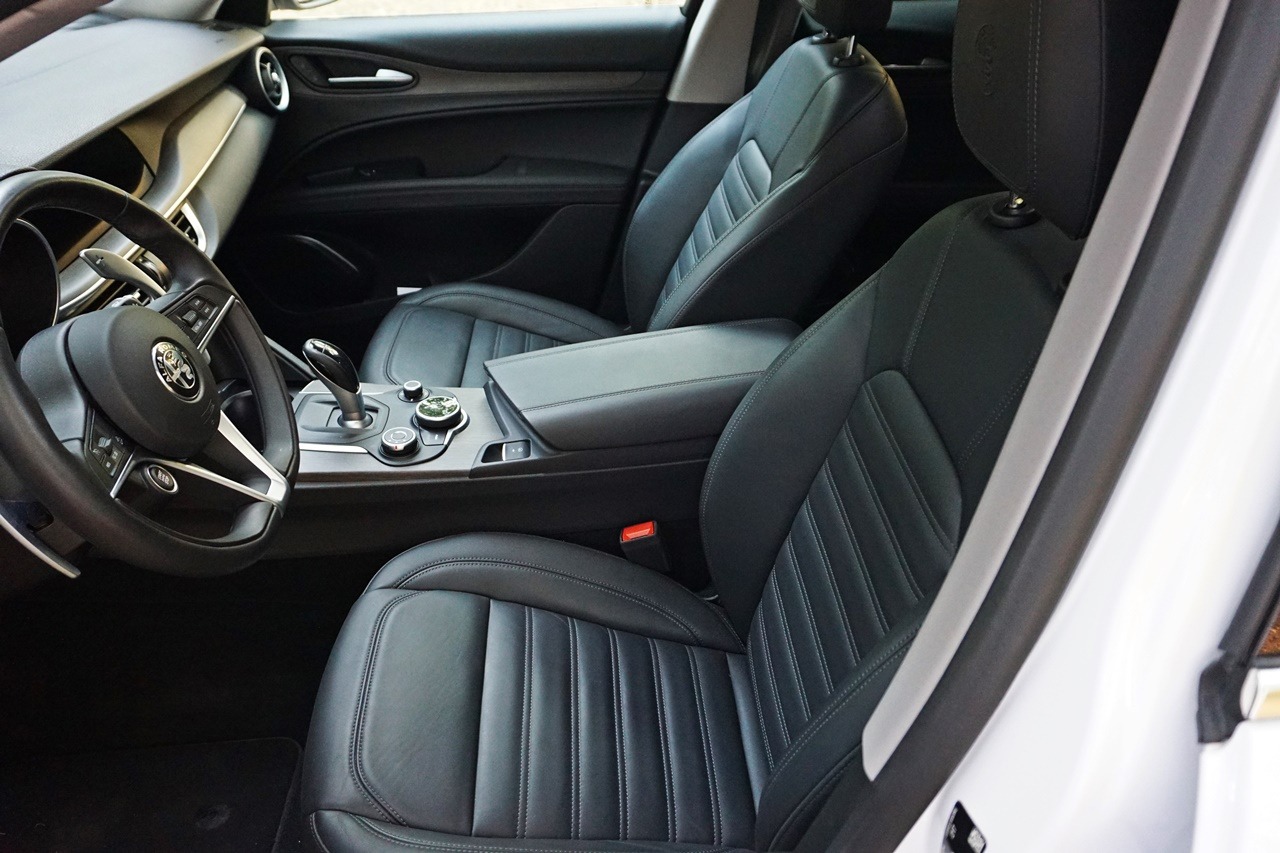 U odnosu na testirane Giulia sedane, a što i jeste bila jedna od najznačajnih primedbi, enterijer zadatak, proizvođač je obavio za klasu uspešnije. Materijali kvalitetniji, završna obrada za nijansu bolja. Ovde čak imamo i intarzije od pravog drveta koje se bukvalno utapaju u panele od veoma prijatne plastike. Kao i u svim plemenitim modelima, i ovde je dosta grama hroma izliveno svuda po kabini, a sve u funkciji zadovoljstva putnika. A putovali smo u njemu i zadovoljni smo, ma prezadovoljni, i to ne samo zbog skoro 282 centimetra među osovinama. Sedišta sportska, elektropodesiva, odlično drže potez slabina/torzo i nude superpregled igre za vozača; na zadnjoj klupi puno mesta ima za osobu visoku 190 centimetara, čak iako je i vozač približne visine (provereno), dok se sedi prijatno zavaljeno sa taman dovoljno uleglim gluteusom i „kičma-friendly“ naslonom. Treći putnik, doduše, morao bi biti jedan od sedam pratilaca Snežane iz prelepe dečije bajke, zbog mesta za noge odnosno umereno izraženog centralnog tunela. Čak ni glavonje nemaju problem sa smeštajem izraženog ekstremiteta, što je pomalo iznenađujuće zbog fabuloznog dizajna i padajuće linije krova. Ipak, na temu preglednosti unazad, preko ramena, plaćen je danak kreativnosti dizajnera zbog podebelih C stubova.