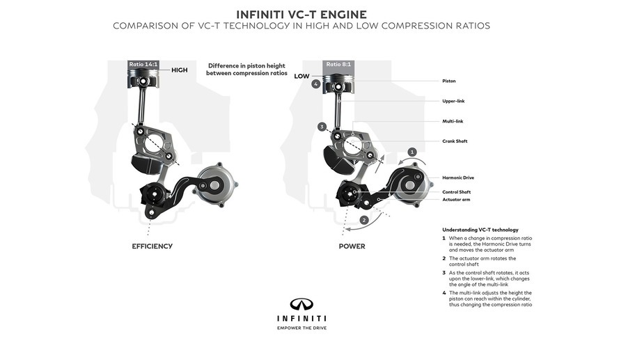 Infiniti/Nissan metod je potpuno drugačiji. Ovo rešenje koristi uravnotežavajući pogon koji menja poziciju pogonske ručice, koja zauzvrat podešava kolenasto vratilo tako da klip dostiže različitu visinu u komori za sagorevanje.