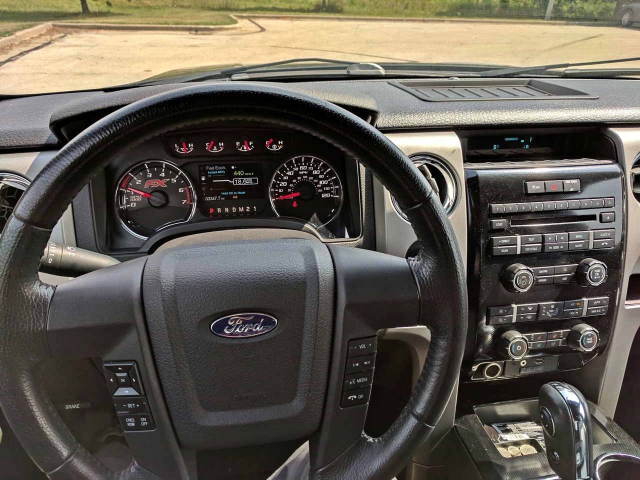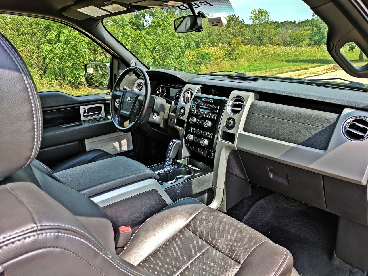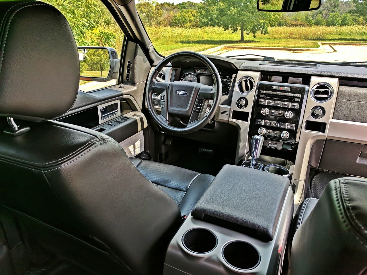 Sam dizajn enterijera je veoma jednostavan i lagan za korišćenje. Brzomer se na momenat čini prezauzetim sa čak šest različitih prikazivača, a u sredini se nalazi i manji monitor na kojem vozač može da dobije dodatne informacije. Ono gde me je enterijer definitivno izgubio je broj dugmića na kontrolnoj tabli – njih čak 45! U vreme dok digitalne komande još uvek nisu bile popularne (barem ne u svetu pikapa), Ford se potrudio za svako dugme ime svrhu. Oko polovina dugmića je otišla na audio sistem dok se ostali uglavnom odnose na klimu i grejanje. Za 2009-2014. generaciju Ford je napravio i par promena u poređenju sa prethodnikom, pa je tako ručica menjača pomerena između sedišta (u prošlosti se nalazila kod volana), dok je i dugme za pogon na sva četiri točka pomereno pored volana (u prošlosti bi tu bila ručica slična menjaču). Ovaj potez je doneo nešto elegantnije linije, ali sa negativne strane je nestala klupa, pa tako F-150 može da smesti „samo“ dve osobe napred umesto tri.