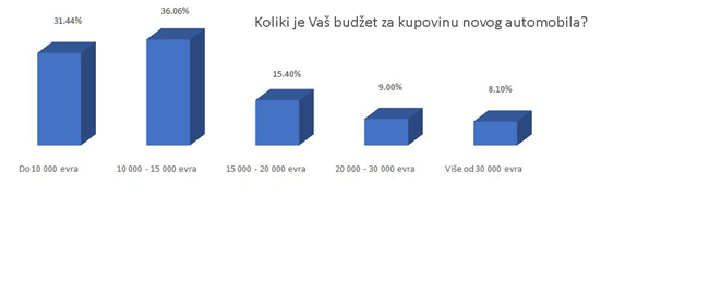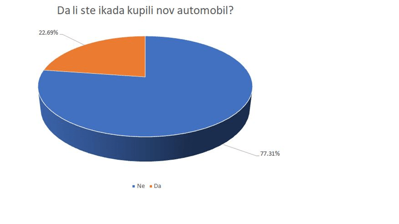 Skoro 70% učesnika u našem istraživanju ni ne planira da kupi nov automobil. U većini slučajeva naši ispitanici jednostavno nemaju dovoljno novca da priušte sebi ovakvu kupovinu. Ne treba zanemariti ni 37% ispitanika koji radije kupuju nešto jeftinije polovne automobile mlađeg godišta nego nova vozila.