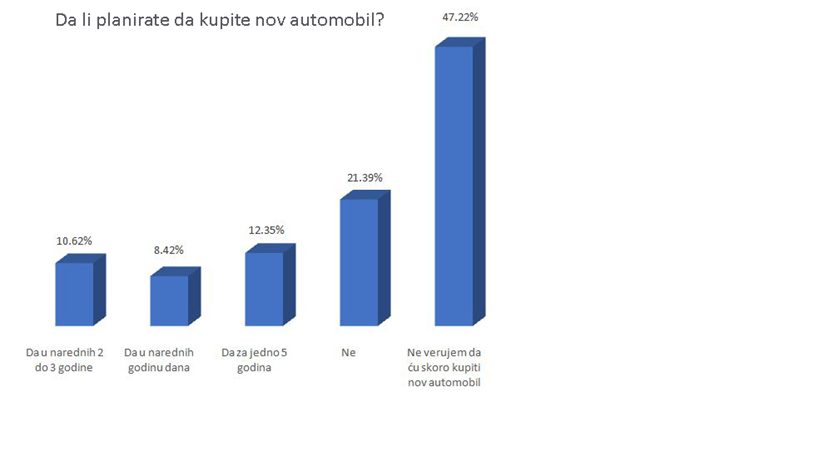 Podatak da 60% ispitanika ne planira kupovinu novog vozila jer nema dovoljno novca jasno govori o ekonomskom stanju i platežnoj moći građana Srbije.