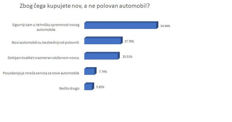 Oni koji se ipak odlučuju na kupovinu novog automobila, najčešće to rade jer su sigurniji u tehničku ispravnost novog nego polovnog automobila. Donekle zabrinjava činjenica da je samo 28% potencijalnih kupaca novog automobila pridalo važnost bezbednosti koju im nova vozila pružaju.
