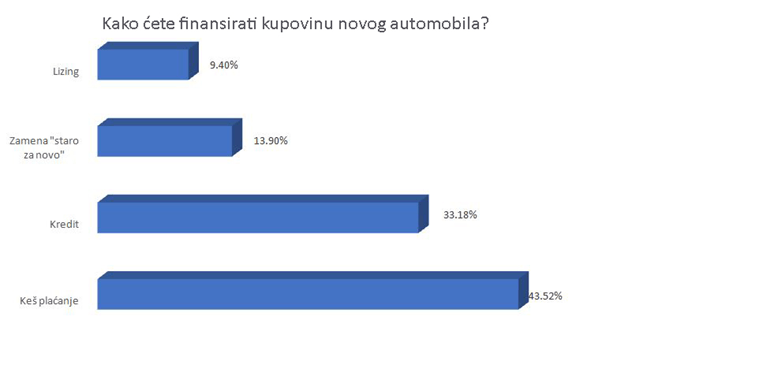 Uprkos sve bogatijoj ponudi na našem tržištu, ipak se samo 33% kupaca opredeljuje za kupovinu novog vozila na kredit. Keš plaćanje i dalje prednjači na srpskom tržištu sa 44% udela u kupovinama. Svega 9% novih automobila će se kupiti na lizing, dok 14% kupaca preferira da svoje staro vozilo u salonu zameni za novo uz doplatu.