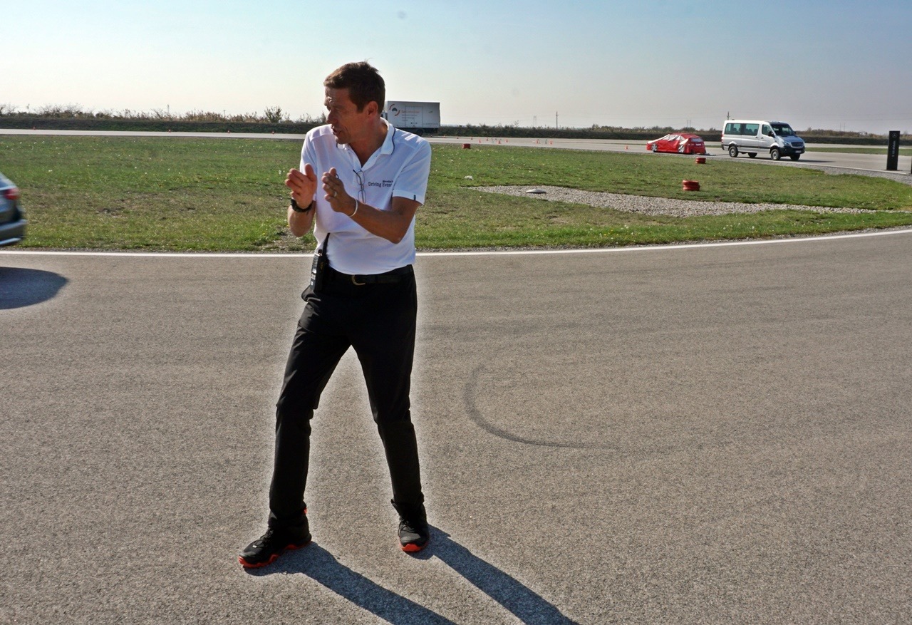 Sledeća Star Experience avantura nam je donela i poznanstvo sa beskrajno šarmantnim instruktorom, ironije li, iz Minhena. Cilj doživljaja je opet bio isti: nauči koliko Mercedes-Benz vozila mogu u realnim uslovima, pa čak i težim. Način: na određenoj distanci se postiže brzina između 80 – 90 km/h, a zatim se nailazi na mesto obeleženo čunjevima gde se aktivira pedala kočnice maksimalnim pritiskom, i u narednih dvadesetak metara je potrebno zaustaviti vozilo, istovremeno prelazeći u susednu saobraćajnu traku.