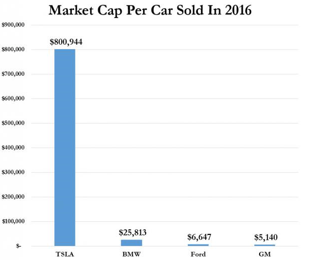 Uprkos svemu ovome, tržišna kapitalizacija kompanije Tesla, koja se definiše kao berzanska cena akcije pomnožena sa brojem akcija (reprezentujući time tržišnu vrednost ukupnog kapitala) je skoro 11 puta veća od knjigovodstvene vrednosti (konzervativan pogled na vrednost kapitala – imovina minus obaveze). Ovako visok iznos razlike između vrednosti kapitala na berzi i u knjigama je, za ovu granu industrije, kao i more drugih pokazatelja, potpuno alarmantan.