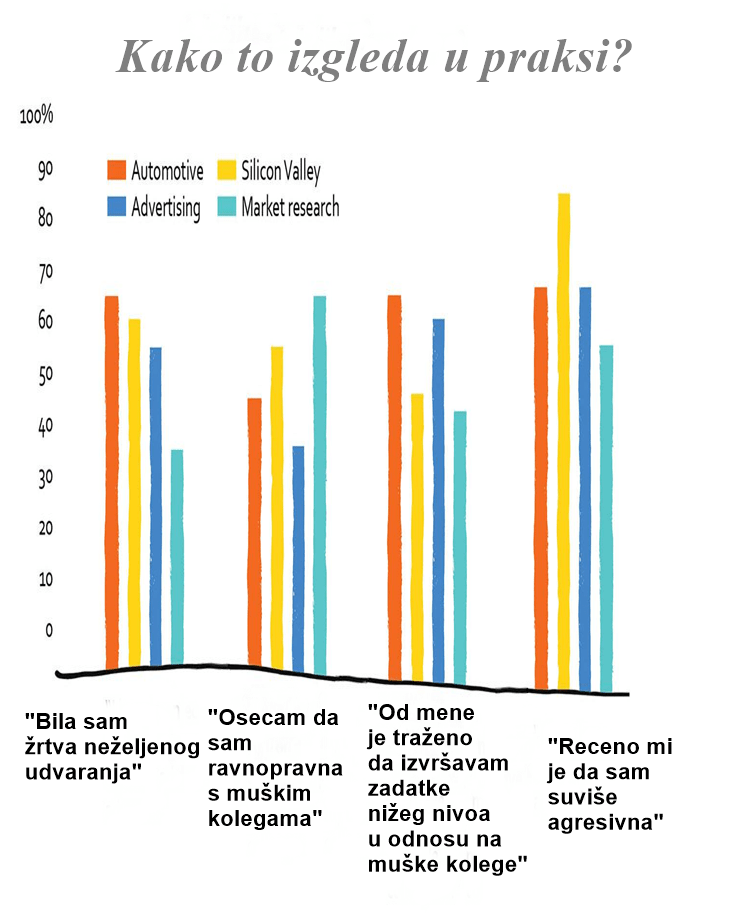 Za potrebe boljeg razumevanja zaključaka o položaju i tretmanu žena u automobilskoj industriji, korišćena su i slična istraživanja, koja je sproveo Stanford univerzitet u delatnostima: IT (Silicon Valley), reklamiranje i marketinška istraživanja. Dame, zaposlene u ovim sektorima, su odgovarale na pitanja, redom: Da li ste bili subjekt neželjenog udvaranja? Da li osećate da uživate ravnopravan tretman na poslu kao i vaše muške kolege? Da li se od vas traži da izvršavate zadatke, nižeg intelektualnog nivoa od onog koji priliči vašoj poziciji u firmi? Da li su vam kolege rekle da ste previše napadni ili agresivni?