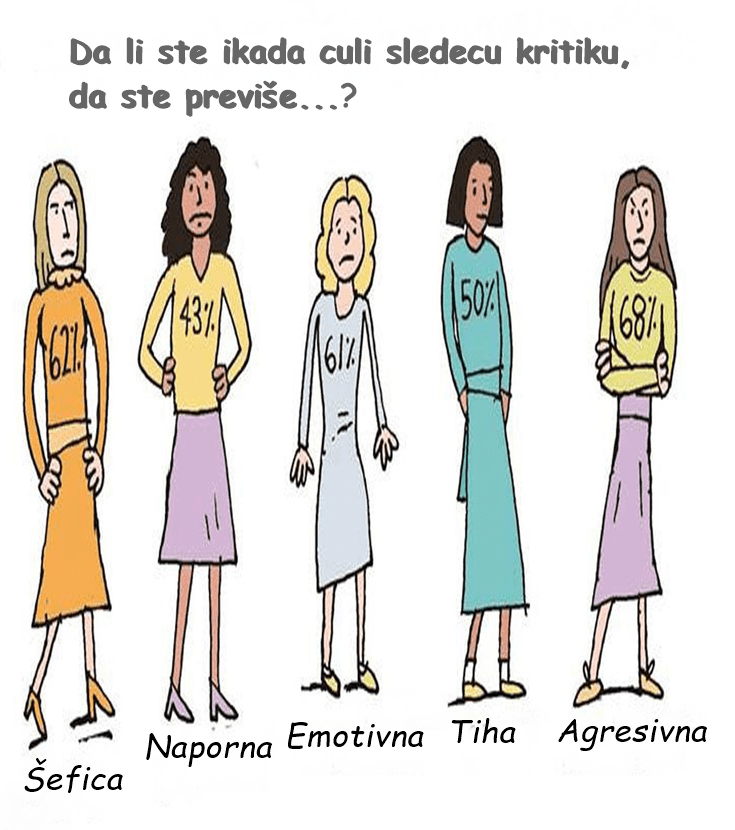 Za žene je veoma teško da odrede granicu između previše ambiciozne i previše slabe. Rečeno im je u 68% slučajeva da su preagresivne; ili previše tihe (50%). Da su sklone šefovskom stavu, čulo je njih 62%, dok su kao previše emotivne, okvalifikovan 61% anketiranih žena.