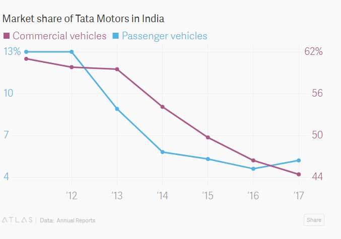 Tata Motors se suočava sa produženom krizom na matičnom tržištu boreći se da održi prodaju svojih putničkih vozila na potkontinentu. Ukupno tržišno učešće vozila koje plasira ovaj proizvođač je takođe u padu. Rangirano prema sadašnjem tržišnom učešću, koje iznosi 5,2%, Tata Motors zauzima tek šesto mesto među najvećim lokalnim proizvođačima automobila.
