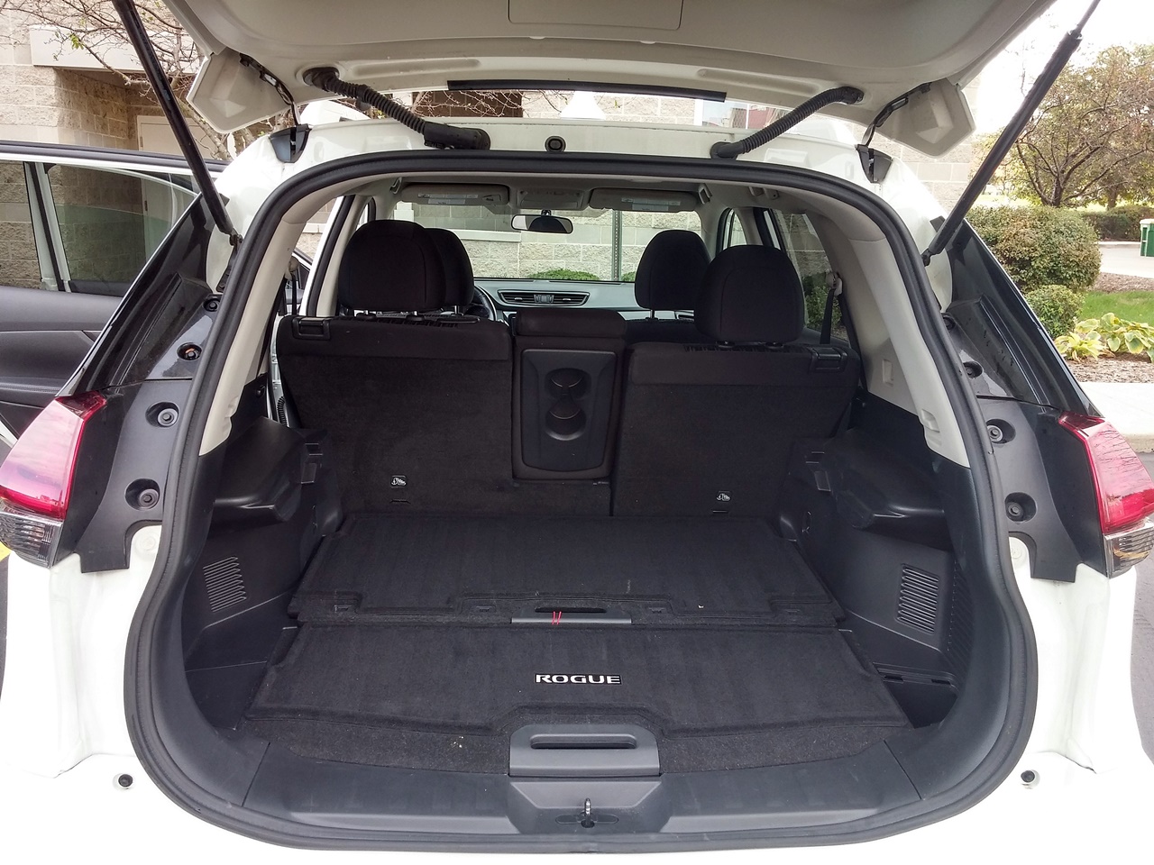 Prva stvar koju ćete primetiti prilikom ulaska u vozilo je koliko prostora Rogue u stvari ima. Zahvaljujući podatku da japanski gigant nije pratio trend sa niskim krovom (tu poziciju zauzima manji Rogue Sport koji je u Evropi poznat kao Qashqai), njegov predstavnik pruža ubedljivo najveći prostor u visini glava u poređenju sa svim konkurentima. Prostor za noge u prvom redu sedišta je takođe pozavideći i samo Ford Escape se može pohvaliti sa većom cifrom. Situacija u drugom redu sedišta nije toliko dobra, pa Rogue zaostaje za Hondom CR-V, Jeep Cherokeejem i Kijom Sportage, ali je razlog neke druge prirode. Naime, Rogue je trenutno jedini krosover u klasi koji se može dobiti i sa verzijom sa trećim redom sedišta, barem do naredne godine kada će u salone da stigne i treća generacija Volkswagen Tiguana. On je smešten uglavnom za manju decu i ne treba očekivati mnogo, ali se lakoćom spušta u pod i na taj način oslobađa poveći prostor gepeka.