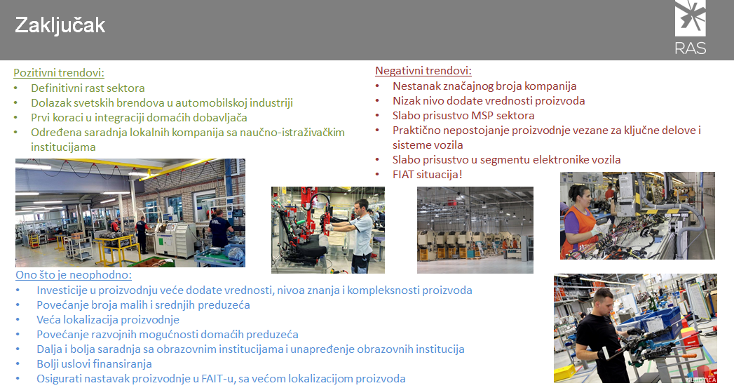 Kao pozitivni trendovi izdvajaju se: definitivni rast sektora; dolazak svetskih brendova u automobilskoj industriji; prvi koraci u integraciji domaćih dobavljača; određena saradnja lokalnih kompanija sa naučno-istraživačkim institucijama.