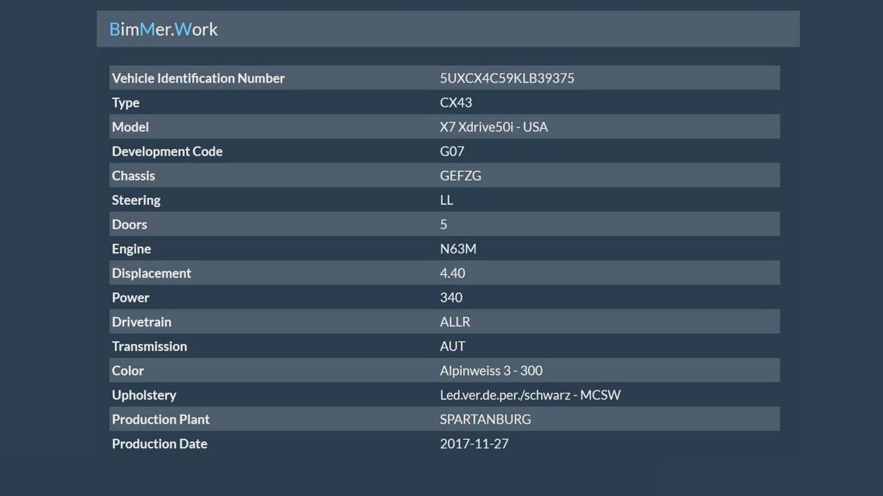 Model koji je trenutno u centru pažnje na globalnom planu je svakako X7, koji je ušao u svoju pretproizvodnu seriju. U ovo digitalno doba nemoguće je sačuvati informacije, tako da su se podaci dobijeni kroz VIN dekoder našli na Bimmer Work internet stranici.