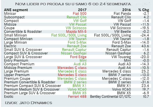 Zahvaljujući bazama podaka kojima JATO Dynamics raspolaže, može se zaključiti, da su u 16 od 24 segmenata, liderske pozicije po prodajnim rezultatima, zadržali modeli koji su na toj poziciji već duže vreme.