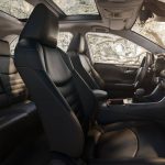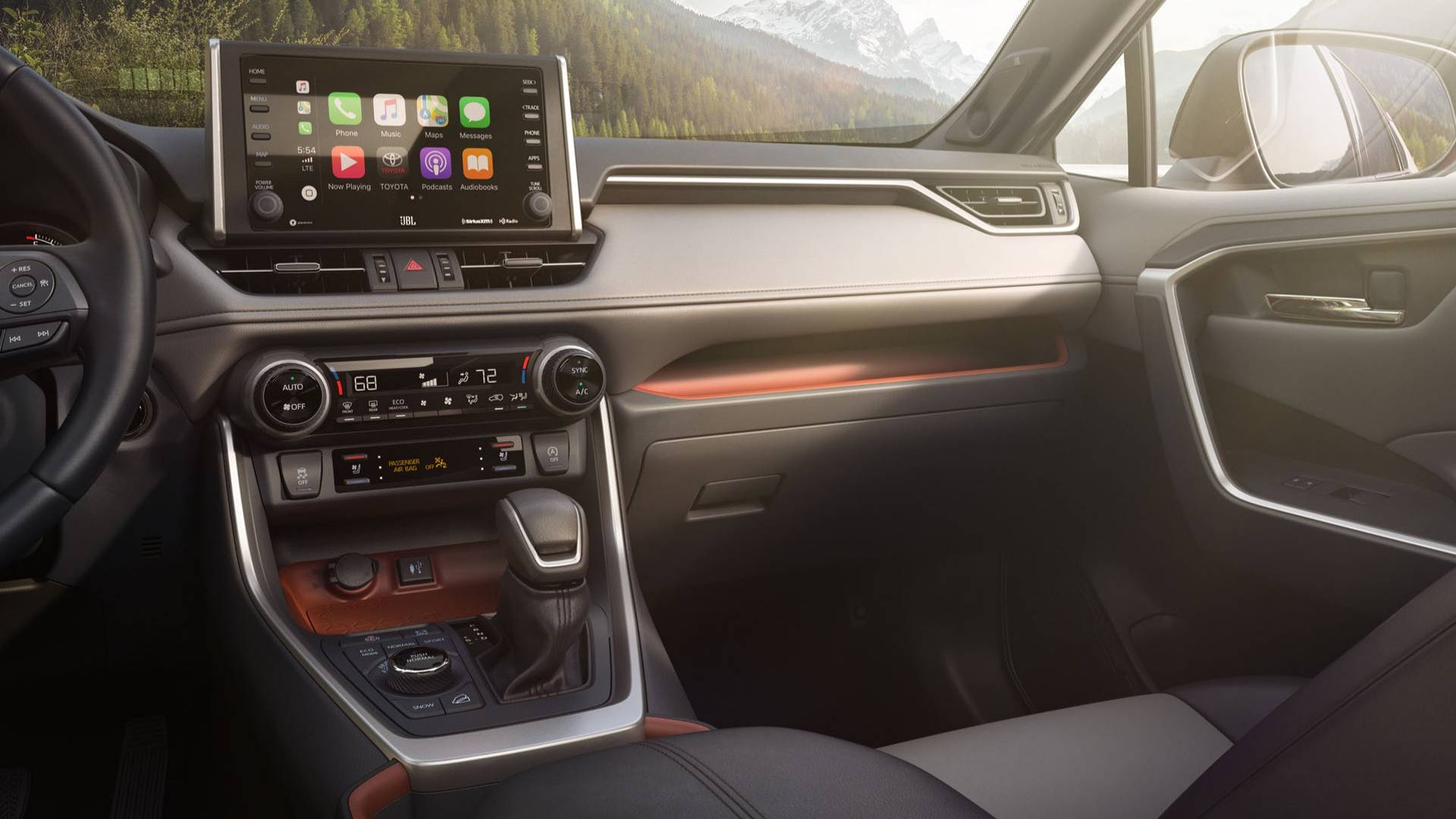 Što se unutrašnjosti tiče, novi RAV4 zauzima minimalistički pristup. Standardni sedmoinčni ekran info-zabavnog sistema se izmestio u „plutajuću poziciju, a osmoinčna jedinica je opciona, kao i Toyota Entune 3.0 audio sistem sa standardnim Apple CarPlay i Amazon Alexa funkcijama. Entune Audio Plus opcija sem većeg ekrana donosi Sirius XM radio, dok Entune Premium opcija dodaje navigacioni uređaj. Tu su brojni USB priključci, bežični punjači, a za audiofile je predviđen JBL sistem od 800 W.