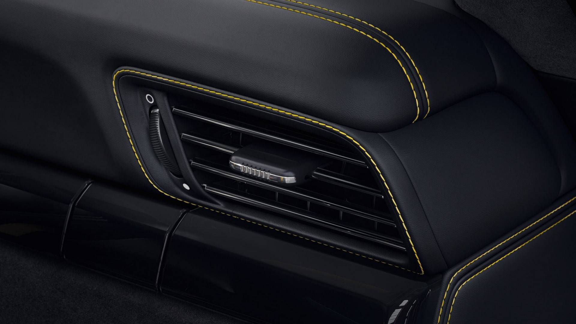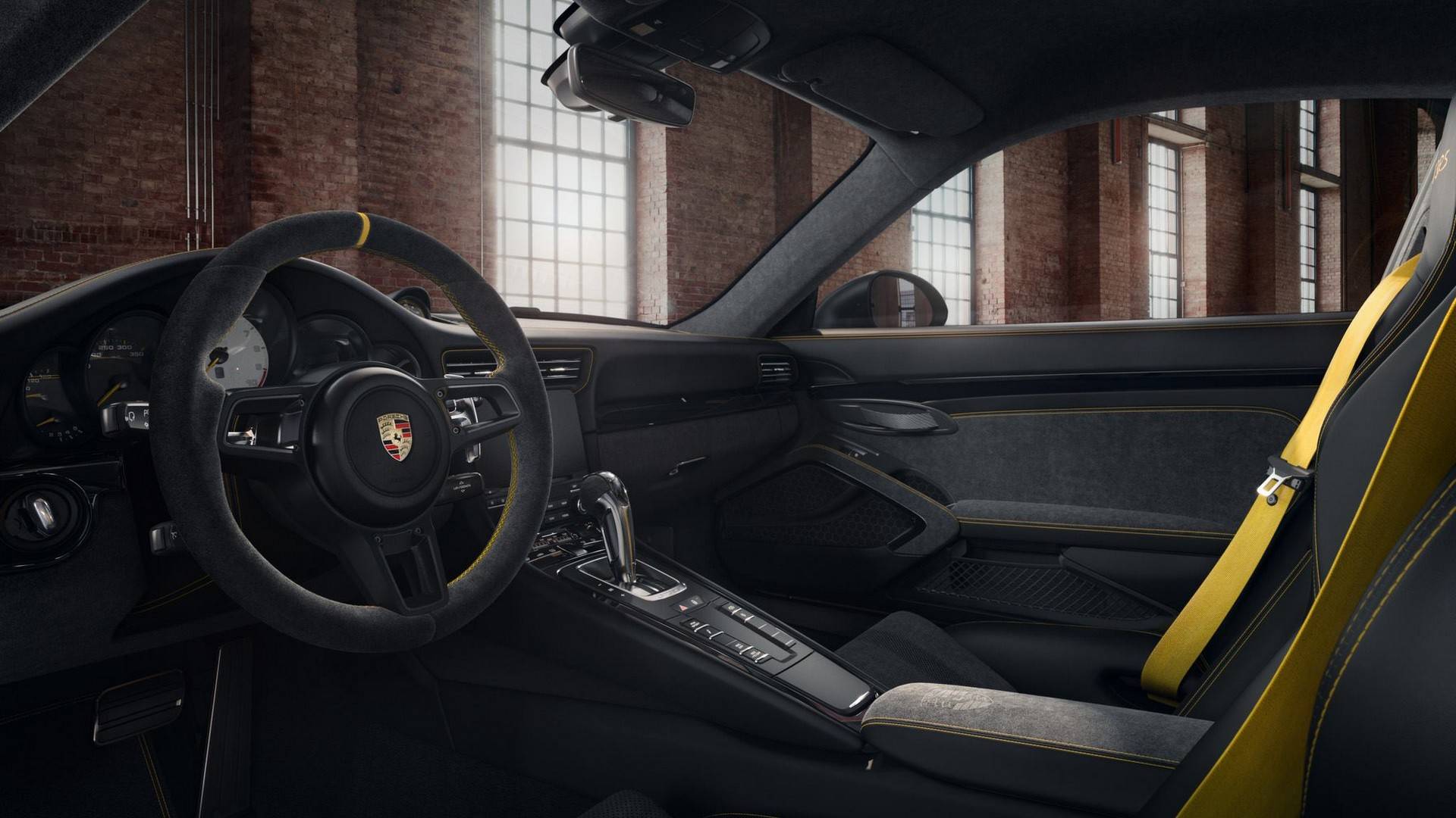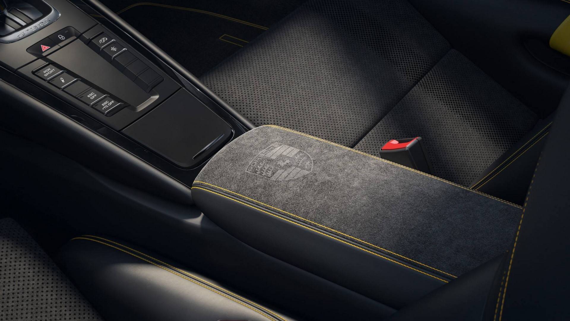 Što se enterijera tiče, tu su žuti akcenti, koji nastavljaju „spoljnu“ temu. Žuti šavovi na sedištima, volanu, armaturnoj tabli i centralnom naslonu za ruku, donose poseban estetski momenat. Nasloni za glavu su takođe ukrađeni „GT3 RS“ logoom, a žuti su i bezbednosni pojasevi.