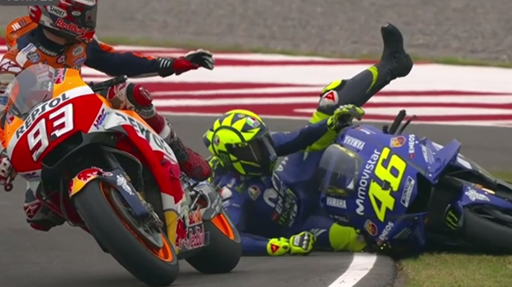 Prilikom pokušaja da pretekne Rosija, jednostavno nije bilo prostora, tako da je Markez naterao Italijana da ide preširoko. Obojica su ostala na motociklima, ali Rosi nije mogao da skrene, tako da se njegova Yamaha našla na vlažnoj travi, zbog čega je pao.