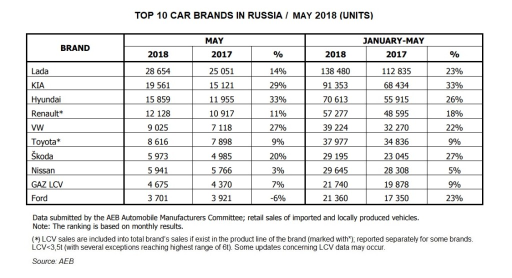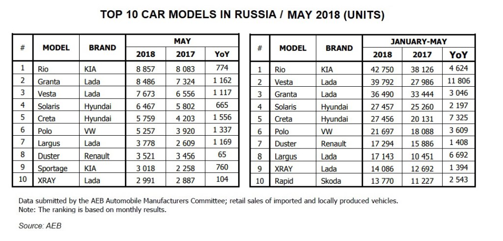 Važno je napomenuti da svih deset prvoplasiranih modela, na prodajnoj rang listi, silaze sa proizvodnih traka kompanija koje imaju sedište u Rusiji. Dalje, iz priloženih pregleda može da se uoči da LADA kao kompanija dominira, ali da je korejski dvojac izuzetno dobro plasiran. Najprodavaniji model u maju, bila je Kia Rio.
