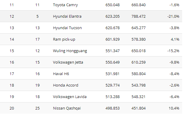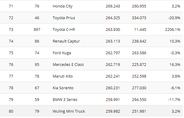 Toyota RAV4, jedan od pionira među SUV modelima, slavi 20 godina postojanja. Poput Civica, pokupila je beneficije na osnovu lansiranja aktuelne generacije, skočivši na peto mesto na listi i dostigavši brojku od 807.401 primerka, što je porast od 11 odsto. Honda CR-V je šesta sa 748.048 jedinica (-0,4 odsto).