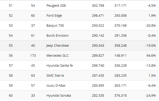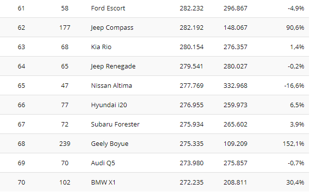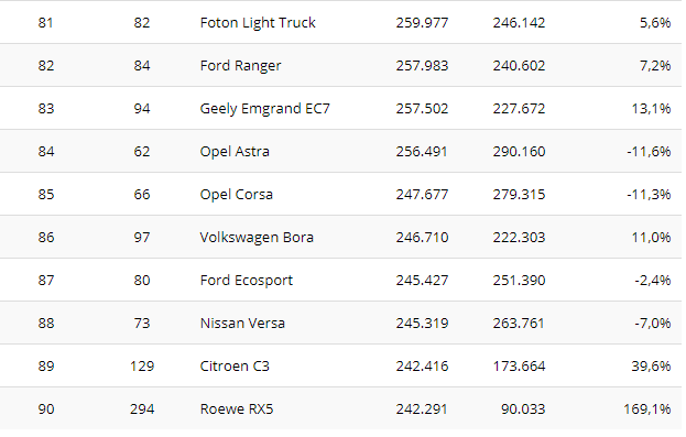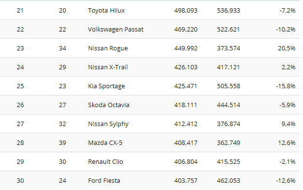 Na sedmom mestu je još jedan „profiter“, VW Tiguan. Nemački krosover se po prvi put našao u prvih 10 i napredovao je za čak 14 mesta, dostigavši 703.000 novih registracija (+34,5 odsto), prestigaviši Ford Focus.