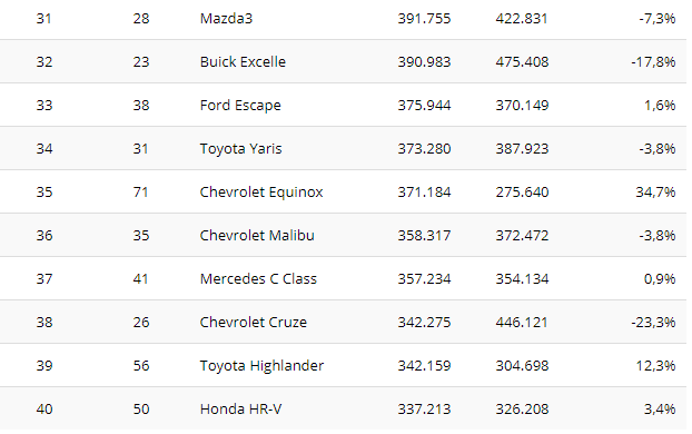Realno je za očekivati da za par godina bestseler bude neki od krosover modela, ali za sada, lider je isti – Toyota Corolla. Japanski kompakt se (u svim verzijama) prodao u 1,22 miliona primeraka, što je pad od 6,6 odsto.