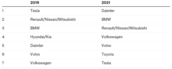 Nemački proizvođači, Daimler, BMW i VW grupa se ubrzano približavaju američkoj kompaniji i vrlo lako bi mogli da je preteknu do 2021. godine. Ovo mišljenje je bazirano na konsultantskom rangiranju proizvođača električnih vozila, a relevantni faktori uključuju strategiju, tehnologiju baterija, kulturu, snabdevačku mrežu, partnerstva i finansijske performanse.