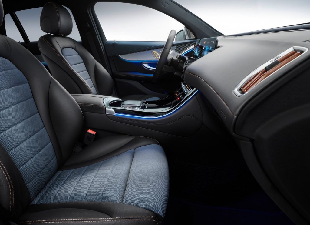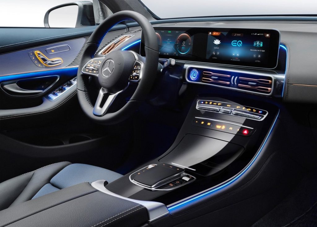 Enterijerom preovladavaju, sada već uobičajeni, Mercedesovi spojeni ekrani koji će služiti za korišćenje svježeg MBUX info-zabavnog sistema. Specifično za EQC su potpuno novi ventilacioni otvori koji su vertikalno postavljeni uz vrata, dok su oni na po sredini horizontalni.