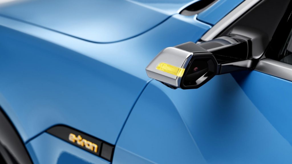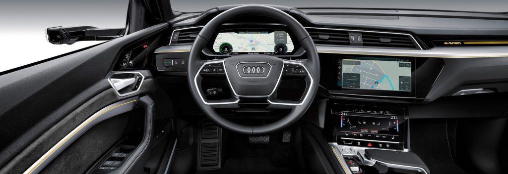 Enterijer je opet lako prepoznatljiv, sa svoja dva centralno postavljena ekrana i još jednim ispred vozača. Jasno se vidi da je dizajn veoma sličan kao kod novih modela kompanije iz Ingolštata: A6, A7, A7 i Q8. Ono što se odmah da primjetiti jeste nedostatak retrovizora, odnosno dva su dodatna ekrana postavljena na panelima prednjih vrata.