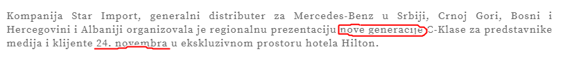 Prekjuče, 24. septembra je održana promocija restilizovane C klase u Beogradu u organizaciji kompanije Star Import, u hotelu Hilton. U saopštenju za novinare je stajalo da je promocija 24. novembra, što su neki mediji nenamerno pogrešno preneli?!