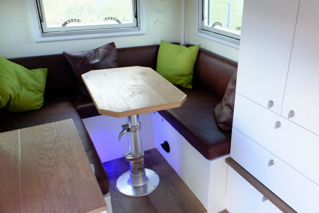 Dnevni boravak ispunjavaju sofa u obliku latiničnog slova “U”, kao i stočić. Tokom noći, krevet za dve osobe poseduje dužinu od dva metra, uz širinu od 1,6 metara. Za osvetljenje prostora zadužene su LED sijalice, koje struju dobijaju iz zasebne baterije čija se dopuna vrši energijom koja se oslobađa tokom vožnje, kao i solarnom energijom iz ploča smeštenih na krovu.