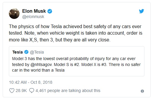 Mask se zatim nadovezao i na bezbednost i tvrdi da su Model 3, Model S i Model X tri najsigurnija automobila na svetu. Ove vesti stižu u vreme kada Tesla beleži rekordnu prodaju, a Model 3 je prethodnih meseci na svom domaćem tržištu nadmašivao celu automobilsku ponudu Mercedesa, BMW-a i Audija po prodaji.