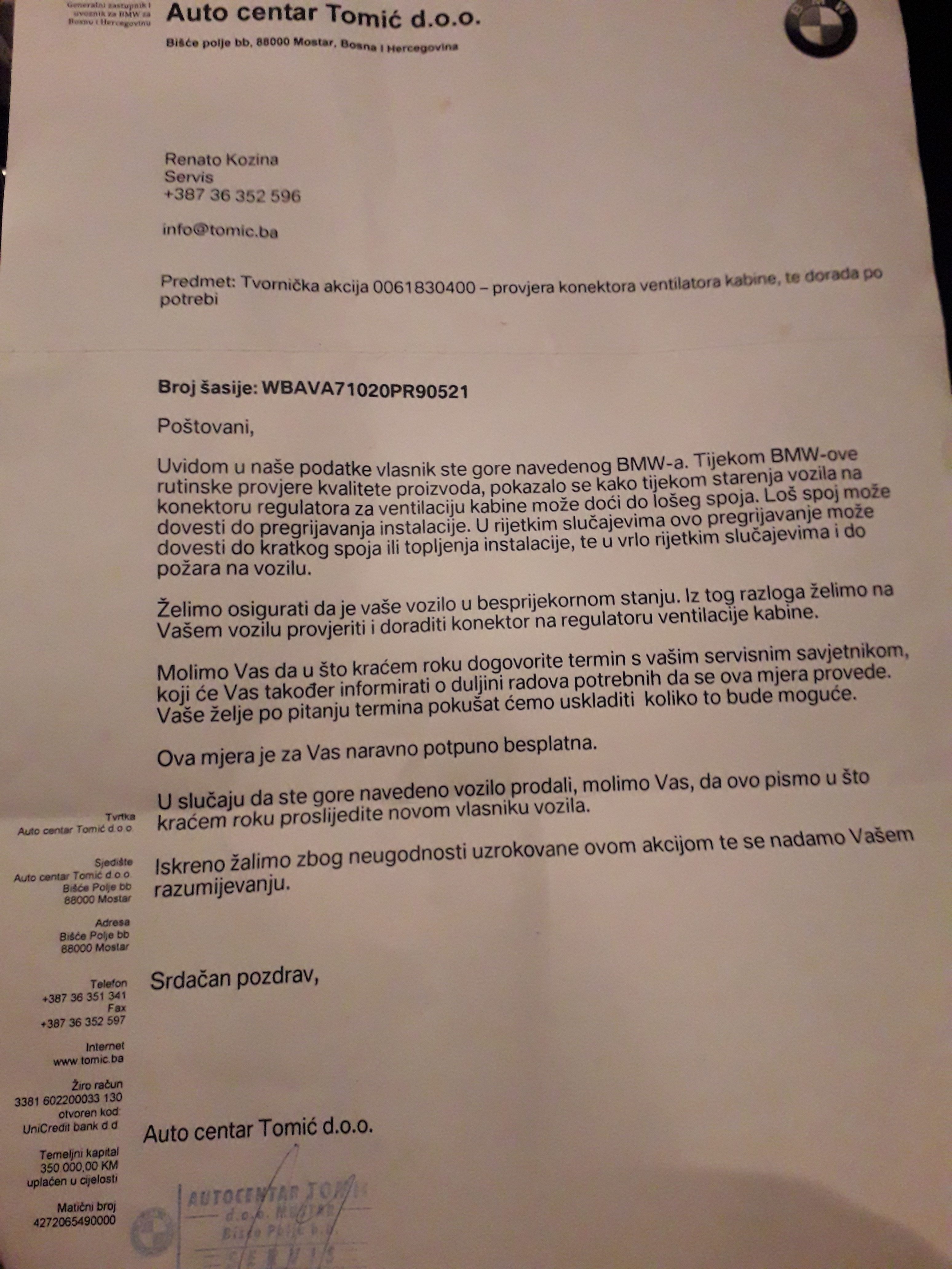Vlasnici pogođenih vozila sa teritorije Bosne i Hercegovine su ovih dana u svojim poštanskim sandučićima mogli da pronađu dopis koji je upućen od strane lokalne trgovačko-servisne mreže. Sadržina dokumenta se odnosi na poziv za obavljanje servisne intervencije na primercima proizvedenim između 2005. i 2007 godine, kojom bi rizik od izbijanja požara.