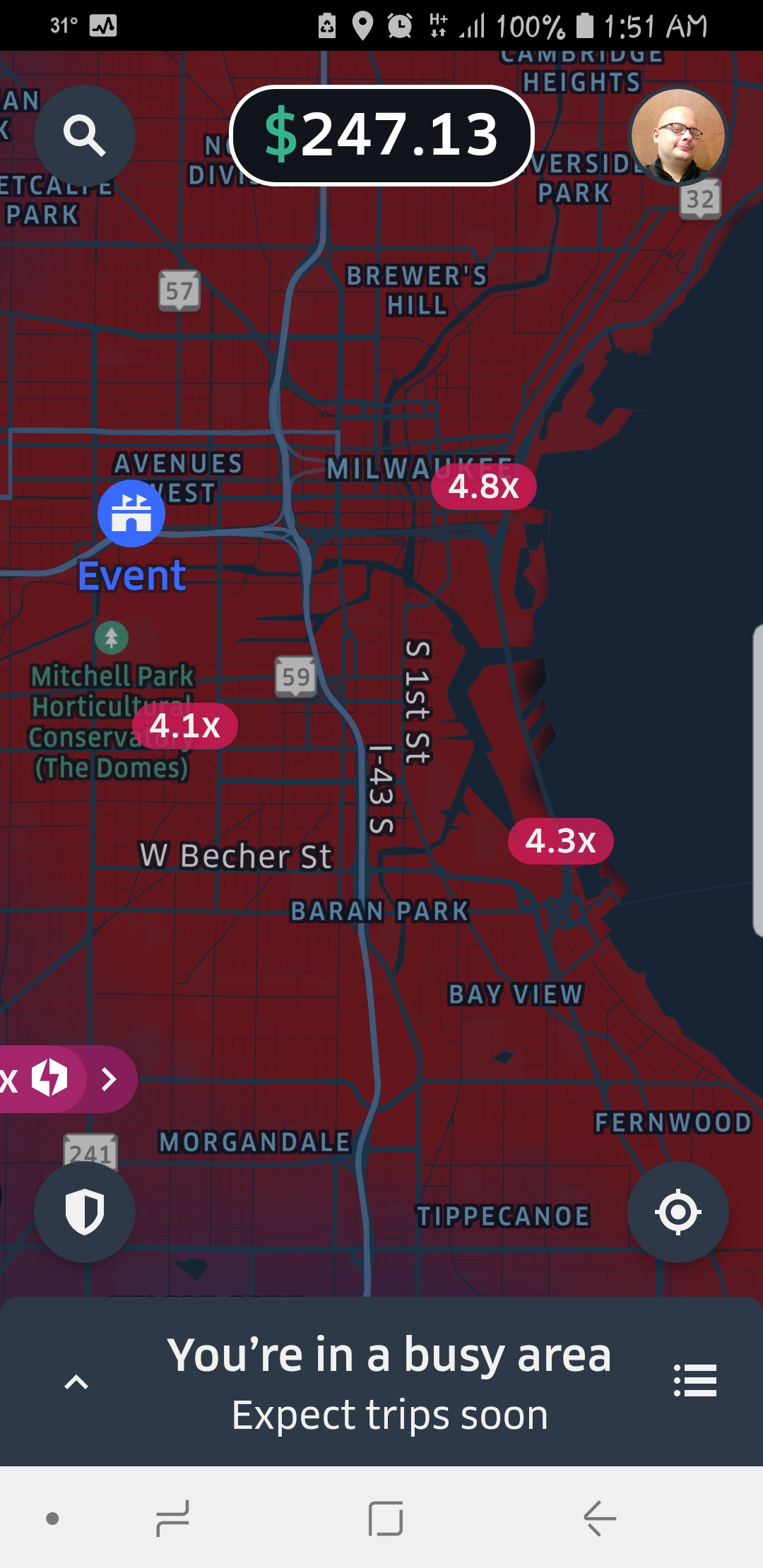 Spomenuću da su cene u jednom momentu bile za oko pet puta veće od standardne i da nijedna mušterija nije bila udaljena više od par minuta od mene, čime nisam gubio mnogo vremena. Taj trend će opstati do tri ujutro, posle čega će usporiti, a ja ću završiti sa vožnjom dva sata kasnije. Na kraju dana, ili tačnije noći, posle 11 sati vožnje sam završio sa 470 dolara u džepu.
