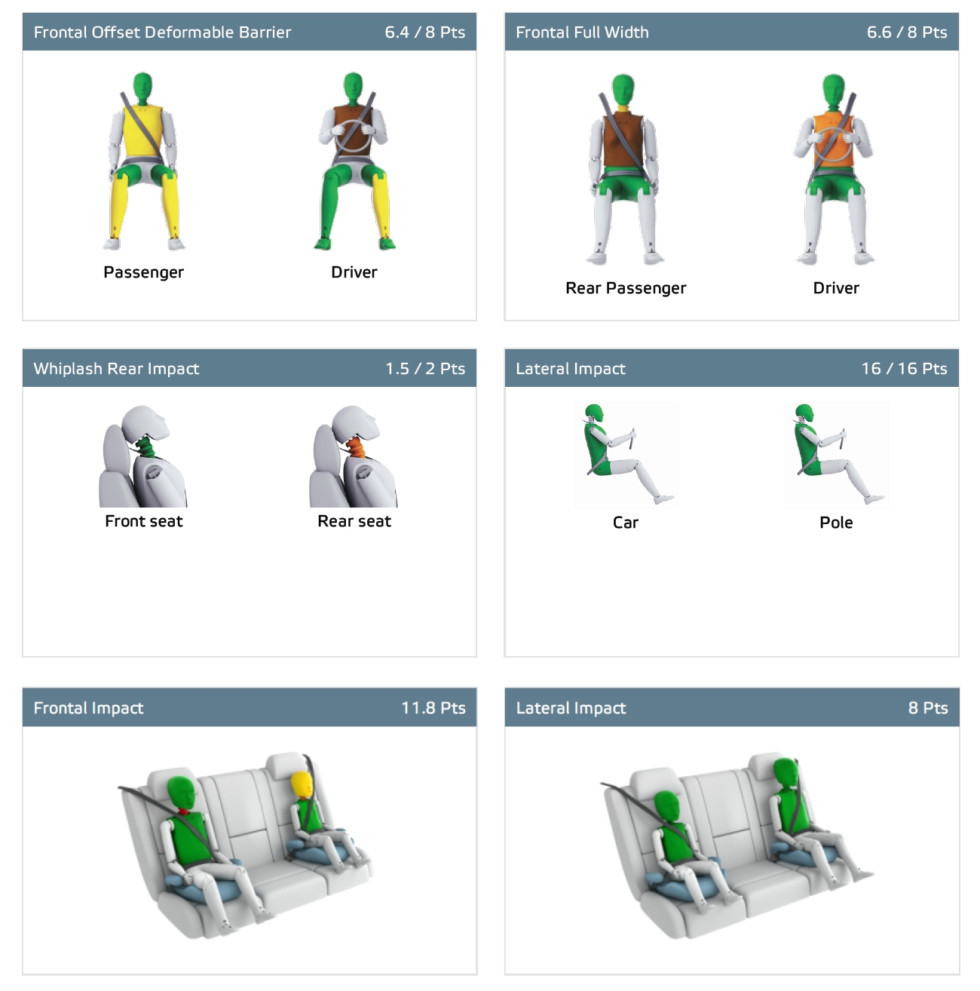 Jedino „opravdanje“ koju G klasa može da dobije je „antička“ konstrukcija karoserije, ali zato peta generacija Honde CR-V ne zaslužuje bilo kakav „popust“. Japanski krosover je imao mnogo bolje rezultate od nemačkog SUV-a, ali je prilikom bočnog udara u stub zabeležen kritičan nivo opterećenja (narandžasto), što znači rizik od preloma rebara i oštećenja unutrašnjih organa. Takođe, narandžasti nivo opterećenja je registrovan na vratu lutke koja oponaša desetogodišnjaka. Geometrija zadnjih naslona za glavu CR-V-a je dobila „crveno“.