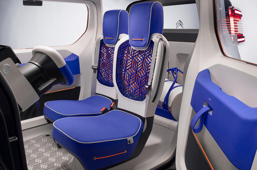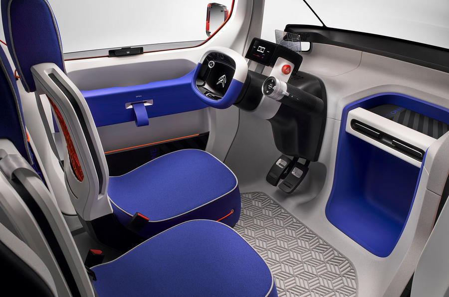 Unutrašnjost koncepta je takođe maksimalno pojednostavljena. Mogućnosti pametnih telefona su maksimalno podržane od strane kvadricikla, a ekran mobilnog telefona se projektuje na prednjem vetrobranskom staklu, poput poznatog HuD sistema. To je zapravo i jedina elektrika u enterijeru simpatičnog četvorotočkaša. Prozori su ili otvoreni ili zatvoreni, nema elektro asistencije, dok je krov sklopiv u maniru koji je svojevremeno promovisala legenda Citroena, model 2CV.