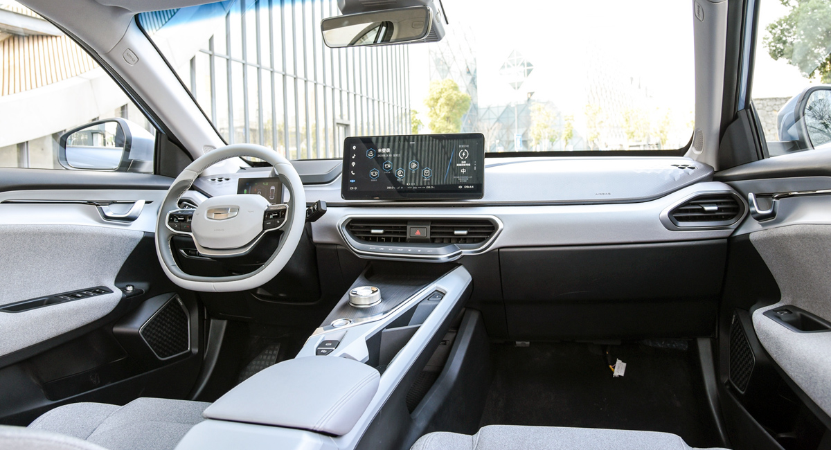 U enterijeru, Geely Jihe A poseduje vodoravno postavljen ekran multimedijalnog sistema osetljiv na dodir dijagonale 12,3 inča, što je opet inferiorno u odnosu na američkog takmaca (15 inča). Pored toga, prisutan je još jedan manji displej dijagonale 4,2 inča, koji je pozicioniran ispred vozača a prikazuje najvažnije informacije od značaja.