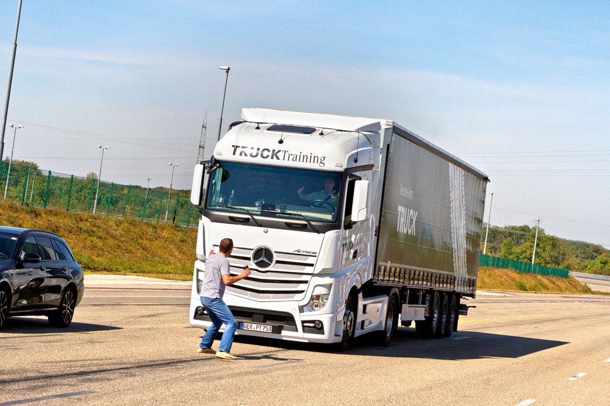 Kao jedan od centralnih momenata na specijalno organizovanom događaju najavljen je test koji je trebao da publici prikaže svu superiornost i pouzdanost savremene tehnologije. Naime, prethodne godine je organizovan sličan scenario u kojem je živa osoba stajala posred druma, dok je nailazio Mercedesov šleper. Bez intervencije vozača, teškaš se zaustavio ispred čoveka, kome zasigurno nije bilo svejedno gledajući u nadiruću grdosiju. Tada je u primeni bio sistem autonomnog kočenja u kritičnim situacijama četvrte generacije.