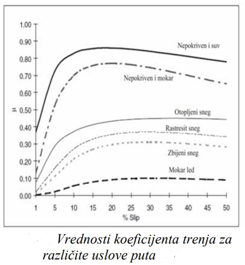 Maksimalni koeficijent trenja pneumatika s određenom podlogom se ostvaruje kada pneumatik proklizava u odnosu na podlogu, u određenom procentu ili slip %. Ovaj procenat je najmanji za dobar asfalt i iznosi oko 18% a najveći za blato i iznosi 100%, što znači potpuno blokiran točak. Za klizav led, iznosi od 30-75%, a za zbijen sneg 50%.