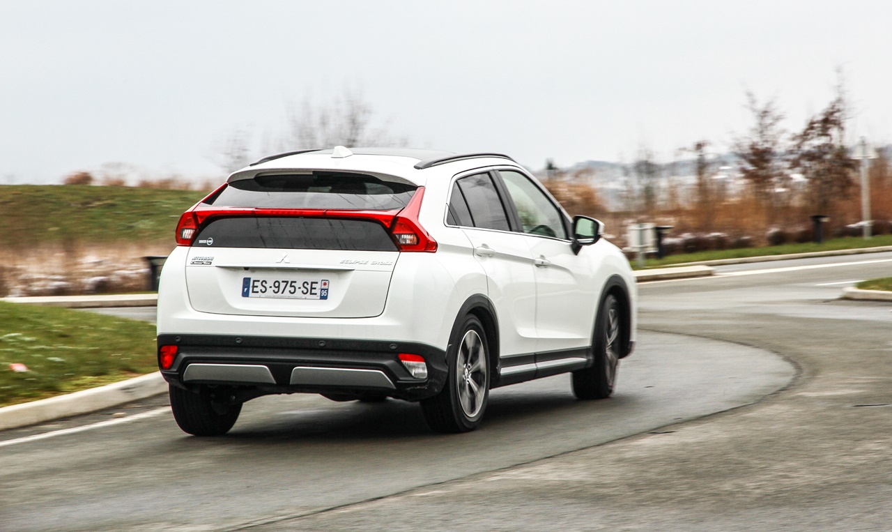 Relativno nizak što se tiče klirensa (183 milimetra), po suvom asfaltu može se voziti veoma temperamentno. Jednim delom na račun udobnosti, jer tvrdo je trimovan, Eclipse ne upija nepravilnosti puta kao pojedini konkurenti, gde pre svega mislim na više puta spomenuti 3008. Bez obzira da li se radi o 2WD ili 4WD, ogibljenje je identično, napred McPherson a pozadi multilink. Vozilo je inače postavljeno na adaptiranoj platformi Outlandera, s relativno velikim međuosovinskim rastojanjem od 2,67 metara.