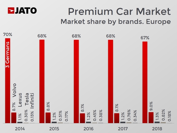Naime, čak 70% tržišnog udela drže Mercedes, BMW i Audi, a ako se apstrahuje još jedino švedska marka Volvo, svim ostalim proizvođačima preostaju mrvice, kojima se „zadovoljavaju“ uglavnom Lexus i Tesla.