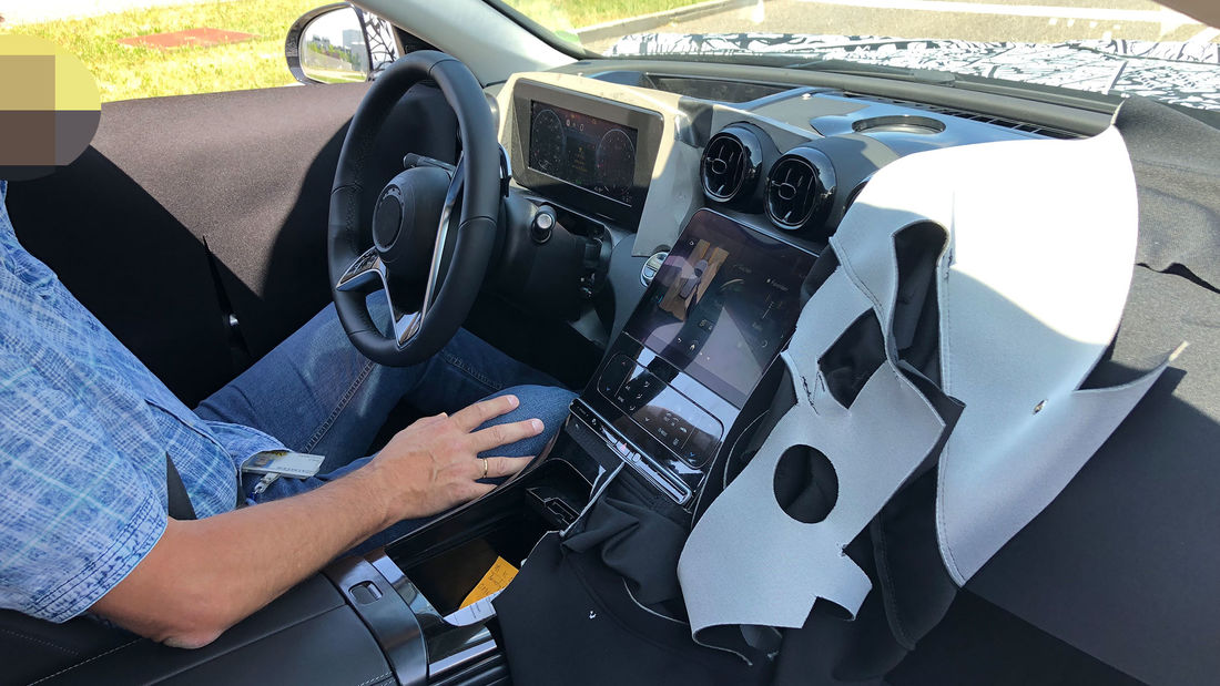 Sledeća C klasa će takođe dobiti potpuno novi volan, veoma elegantnog dizajna. Centralnom konzolom dominira ekran info-zabavnog sistema, a sudeći po fotografiji, u 16:10 formatu. Potpuno je za očekivati da će C klasa koristiti drugu generaciju veoma impresivnog MBUX info-zabavnog sistema.