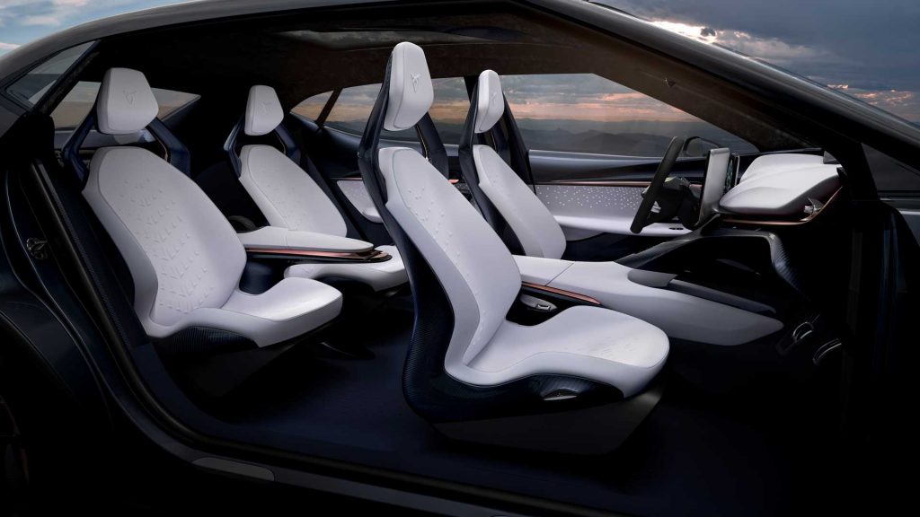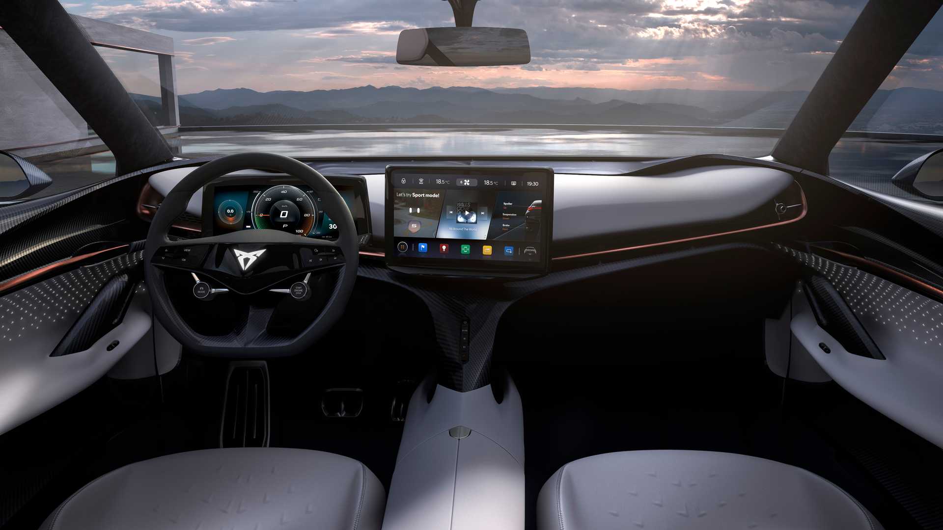 Mada takođe dramatičan na prvi pogled, enterijer je bliži nečemu što bismo nazvali serijskim. Već poslovično, armaturnom tablom dominira veliki ekran osetljiv na dodir, a tu je i drugi za klaster instrumentacije.