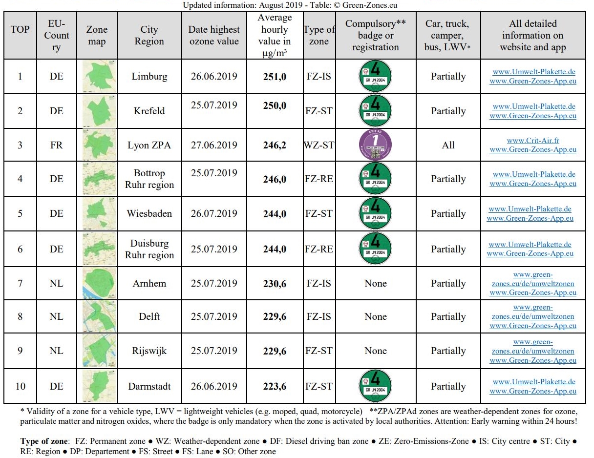 „Zone zaštite životne sredine u Rurskoj oblasti i Visbadenu su pozicionirane u sredini, a tamo je ozon dostigao koncentraciju od 244-246 µg/m³ ovog leta, a da javnost nije o tome informisana na pravi način. Nemački Limburg je prvi među najopasnijim zonama zaštite životne sredine u Evropi. Maksimum je u uniji dostignut 26. juna, kada je izmeren 251 µg/m³, kao prva prosečna vrednost u zonama zaštite životne sredine, a za razliku od francuskog Liona, niko nije uveo zabranu vožnje“, piše Green-Zones.