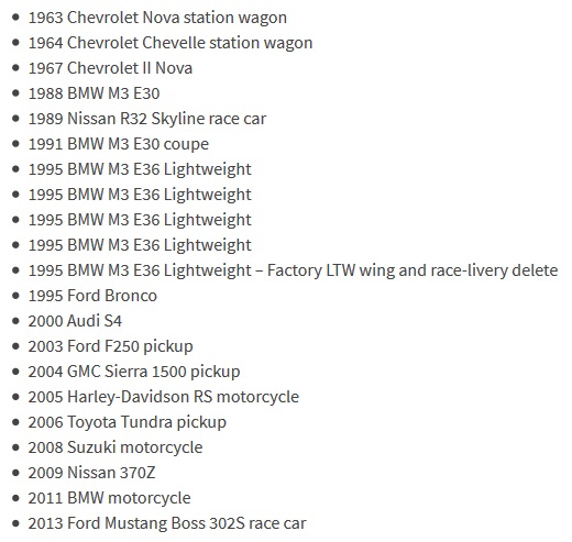 Kolekciju sačinjava nekoliko klasičnih američkih karavana (Chevrolet Nova i Chevelle), ali modeli koji privlače najviše pažnje su BMW M3. Čak sedam će se pojaviti na aukciji i to dva iz E30 generacije i pet iz E36 generacije. Očekuje se da će upravo E36 dostići najvišu cenu pošto je reč o izuzetno retkim „Lighweight“ (Lagani) modelima. Oni su bili namenjeni američkom tržištu samo 1995. godine, a prodato je svega 125 jedinica.