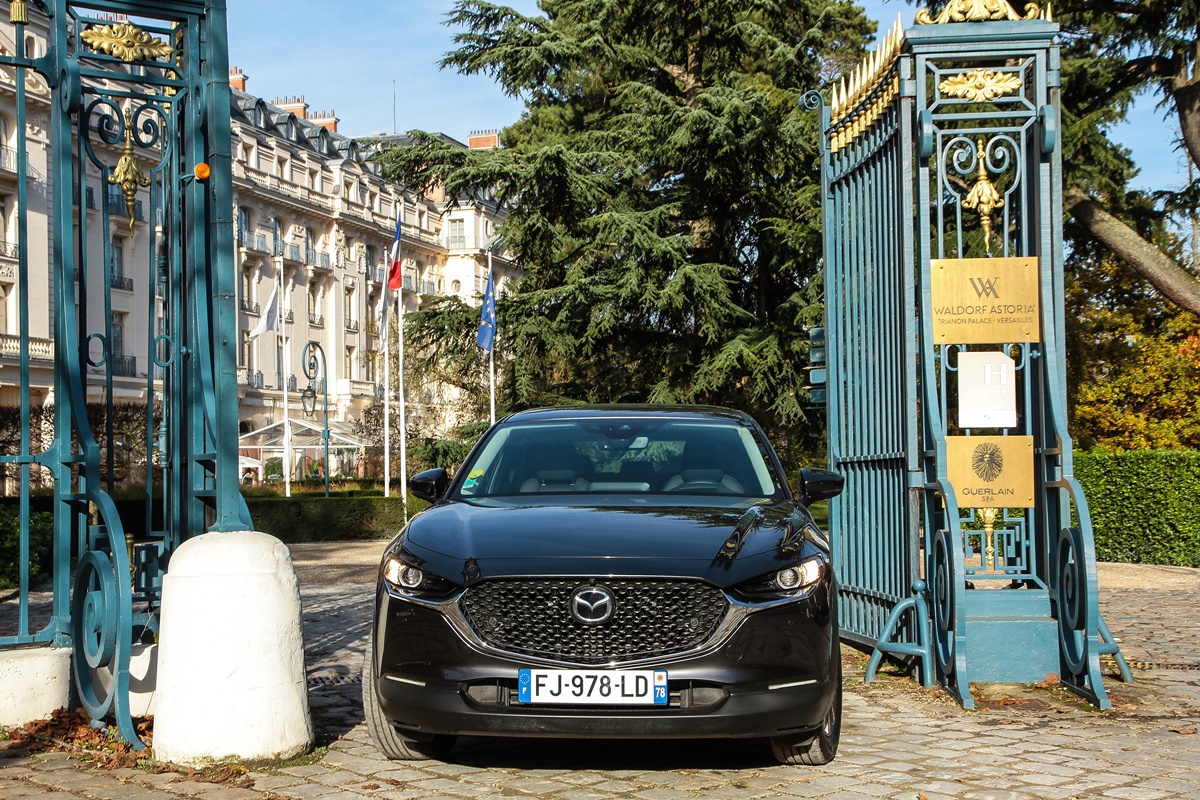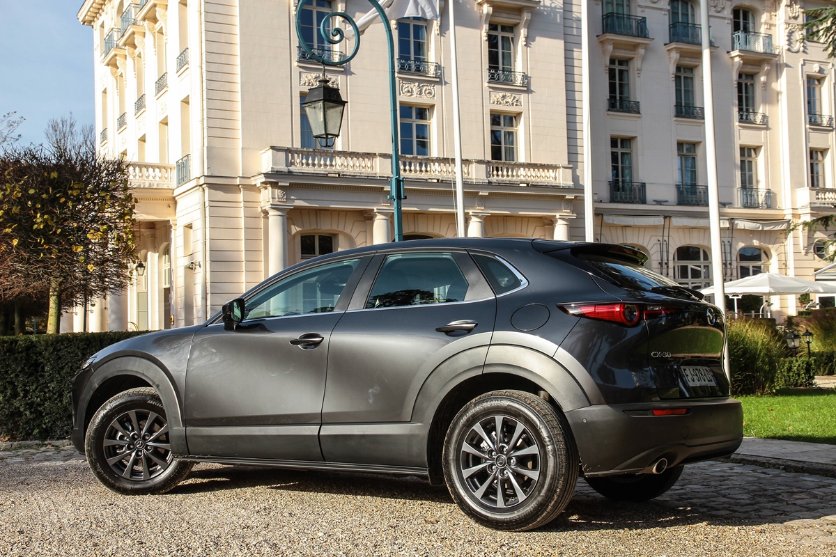 SUV atributi pojačani su većim odstojanjem od tla (17,5 santimetara), kao i navedenim plastičnim zaštitama po donjem delu vozila i na prorezima točkova. Nažalost, ubačeni su nekako grubo, bez respekta prema oblinama karoserije, tako da kada se otvore zadnja vrata, špicasta plastika s unutrašnje strane blatobrana štrči 5-6 santimetara , jer u osnovi CX-30 je baziran na „trojci“, hedžbeku u C segmentu, od kojeg je bizarno kraći za nekih 7 santimetara. Samim tim, ova Mazda je za protivnike dobila jedan Volvo XC40 (4,43 metra), Škodu Karoq (4,38 metara), Seat Ateca (4,36 metra), Peugeot 3008 (4,44 metra), Mercedes GLA (4,42 metra), BMW X2 (4,36 metra)…