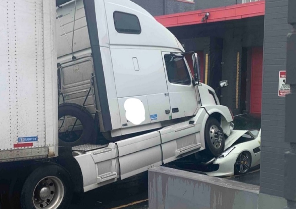 Na fotografijama može da se vidi Volvo kamion koji je „zgazio“ Ferrari GTC4Lusso u pristaništu. Različite su tvrdnje zašto je došlo do ovog „sudara“.