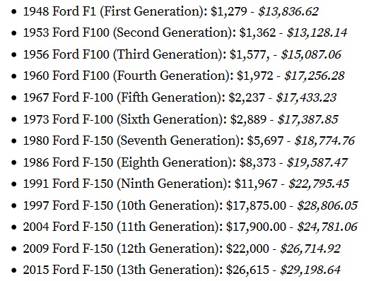 Ukoliko pogledamo listu, u 72 godine proizvodnje cifra koja ilustruje prodajnu cenu je skočila više nego dvostruko. Naravno, tu ne možemo zanemariti i da moderni modeli pružaju daleko veću snagu, bezbednost, opremu i još mnogo toga. Za one koji koriste pikape isključivo za posao, još jedna cifra je izuzetno bitna, a ona se odnosi na preporučljiv maksimalni vučni kapacitet. Prvi F1 se mogao pohvaliti s cifrom od svega 2.115 kilograma dok je današnja brojka čak 5.400 kilograma.